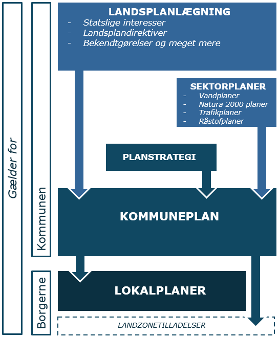 Kommunen har ansvar for at udarbejde plantyperne; planstrategi, kommuneplan og lokalplaner - deres sammenhæng med øvrige planer, og hvem de gælder for, er illustreret på nedenstående figur.